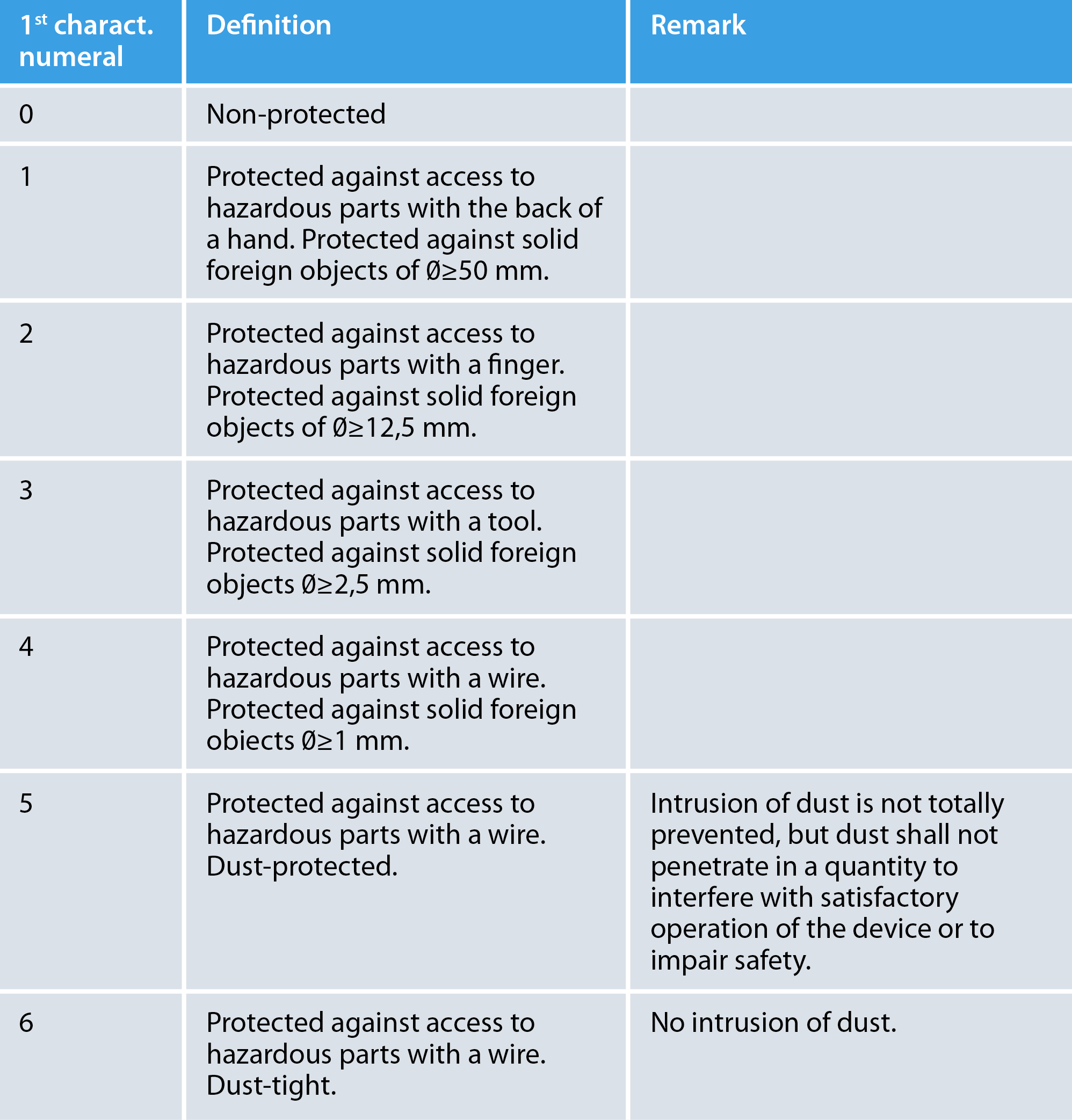 - First digit (0–6): Protection against solid particles (e.g., dust).