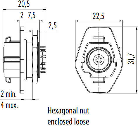 • Female panel mount connector provides protection of intrusion of liquids, water splash and of touching the contacts
