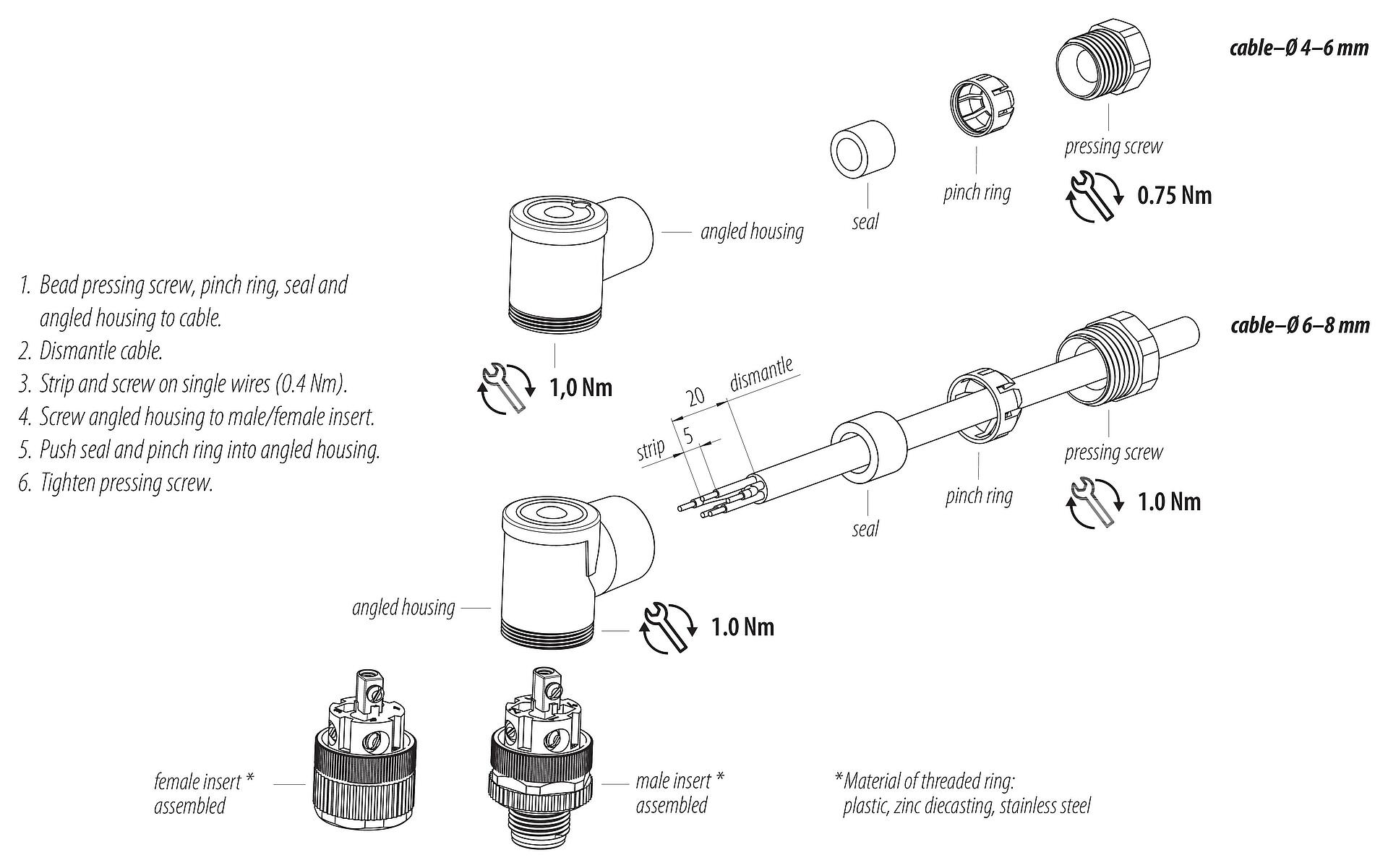 3. To protect against unintentional opening of the connector, the thread between the housing and the connector head must be secured with a suitable cyanoacrylate adhesive when used in circuits with voltages dangerous to the touch. This does not apply to connectors used in SELV and PELV circuits according to IEC 61140 (EN 61140, VDE 0140-1).