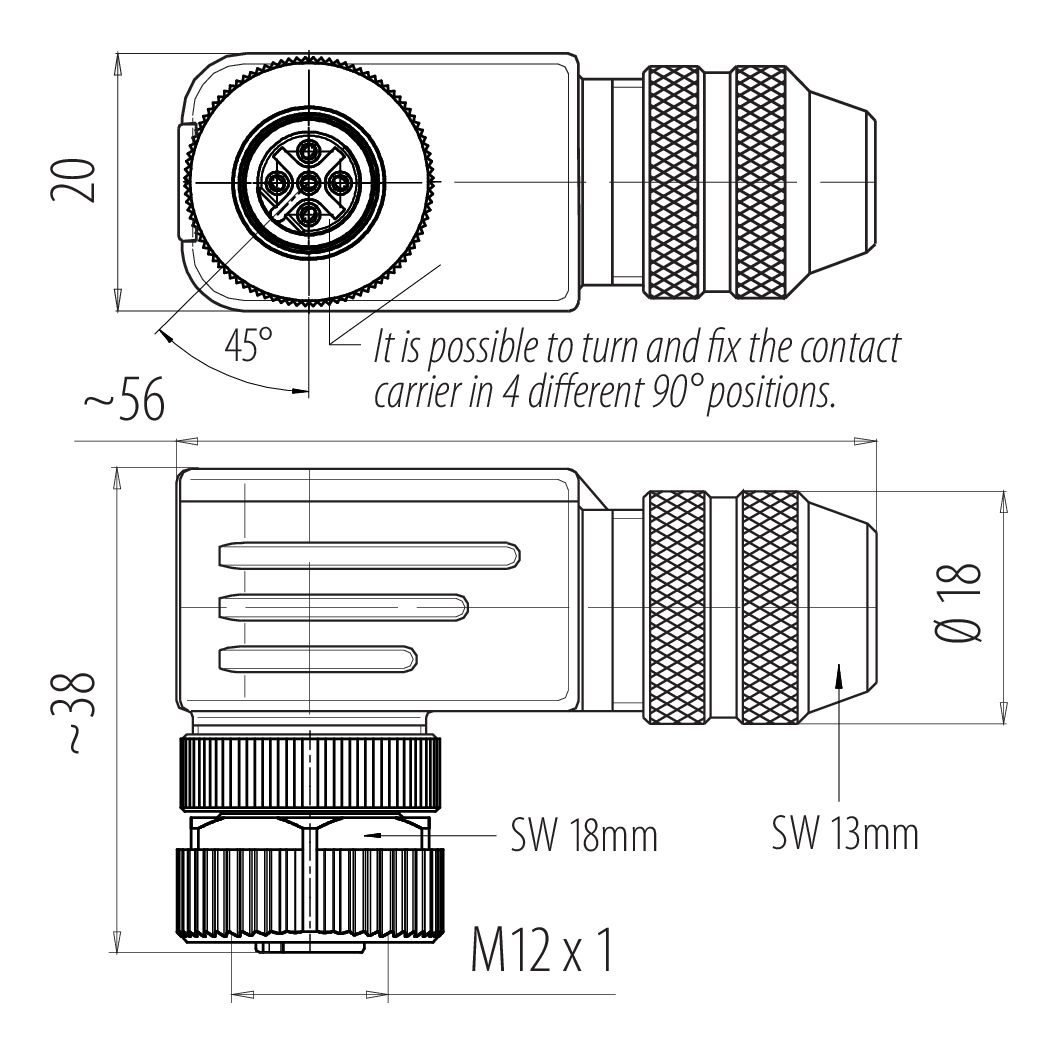 M12 Female angled connector, Contacts: 4, 6.0-8.0 mm, shieldable, screw clamp, IP67, UL 2238, with shielding ring