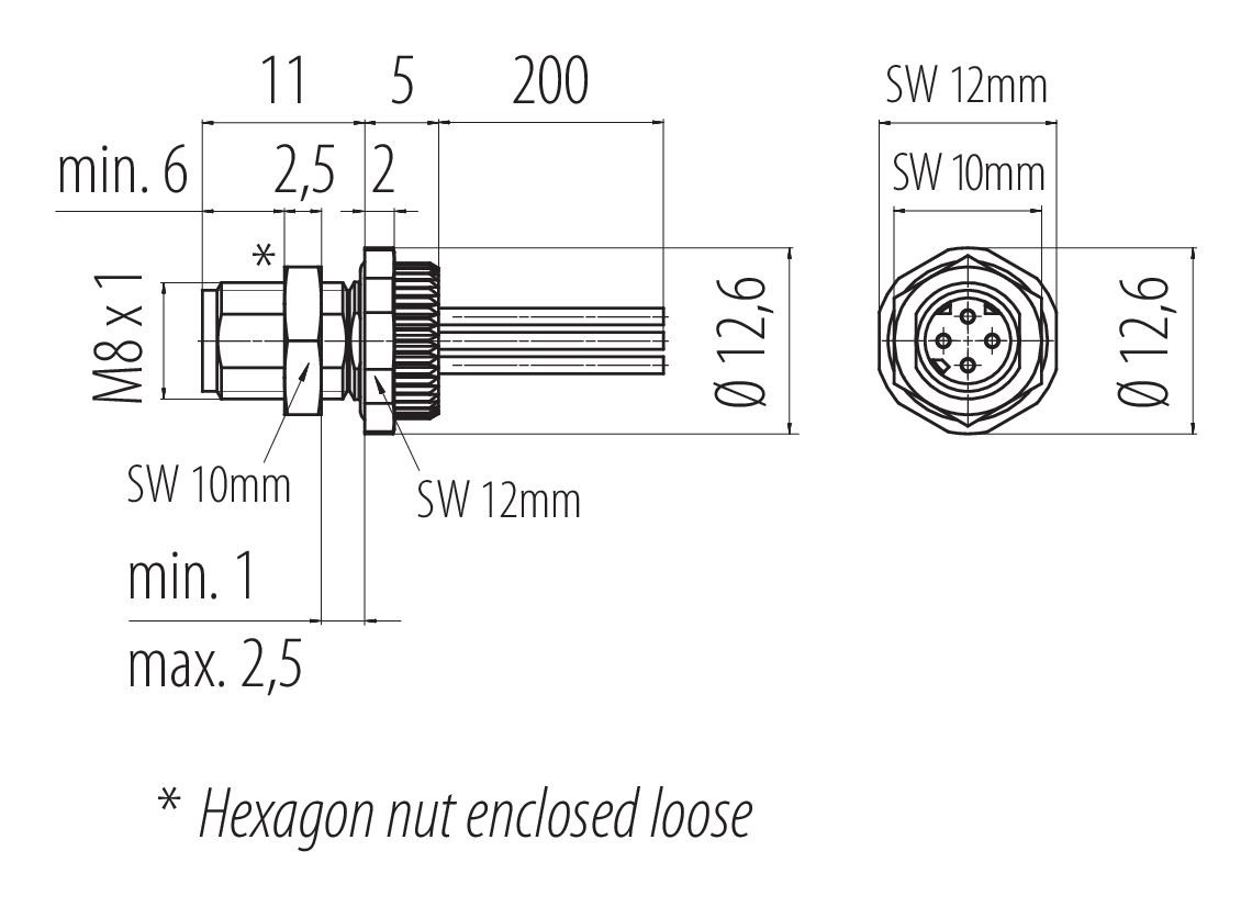 M8 Male panel mount connector, Contacts: 4, unshielded, single wires, IP67, M8x1.0, Rear mounting