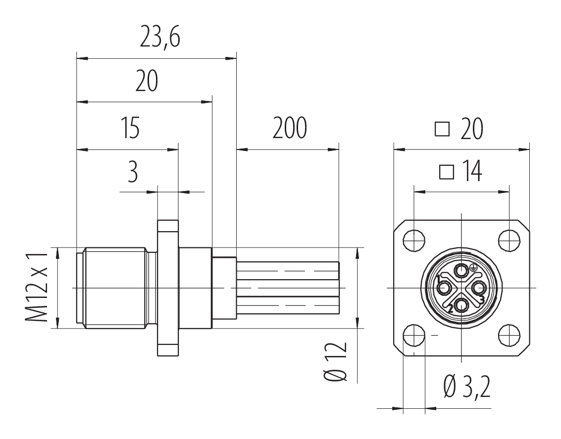 M12 Square male panel mount connector, Contacts: 4, unshielded, single wires, IP40, UL 2238, M3 (4x), Front mounting