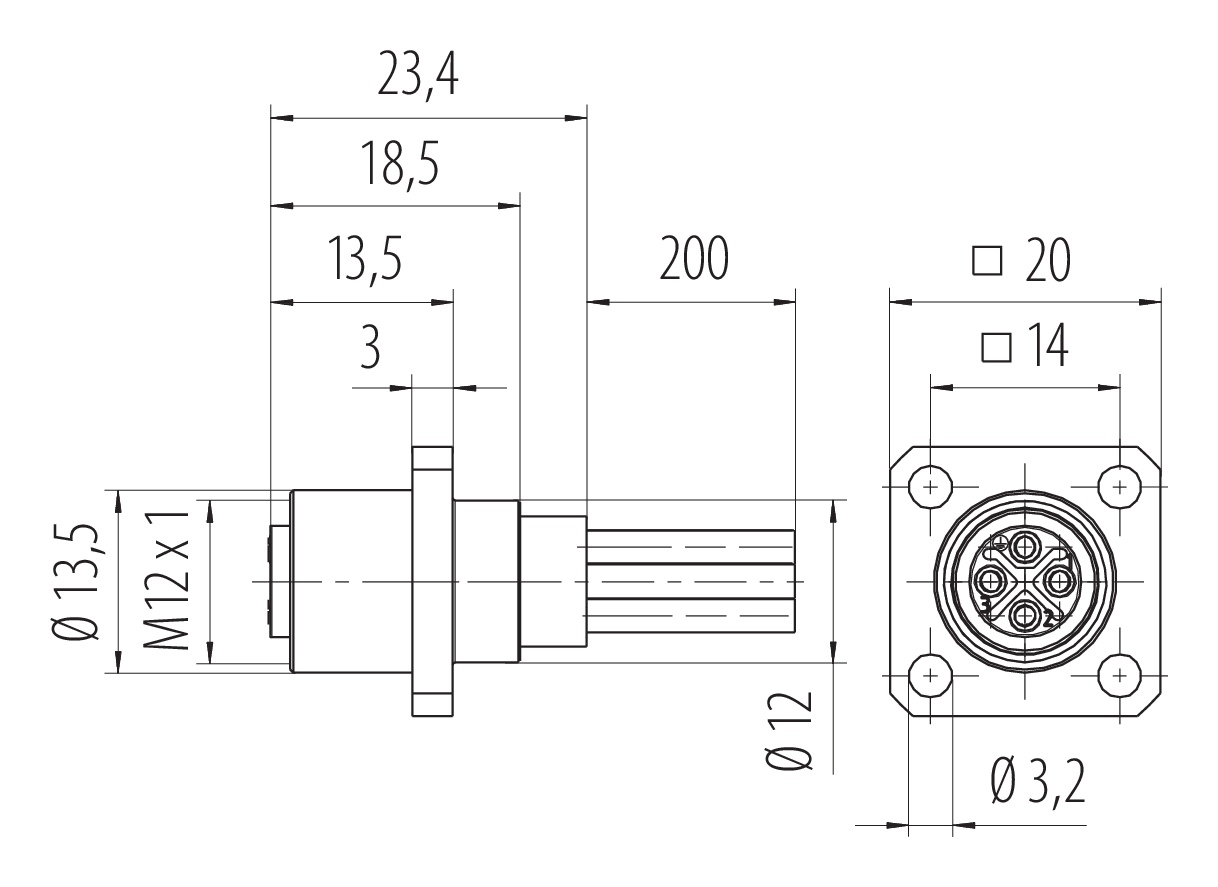 M12 Square female panel mount connector, Contacts: 4, unshielded, single wires, IP40, UL 2238, M3 (4x), Front mounting