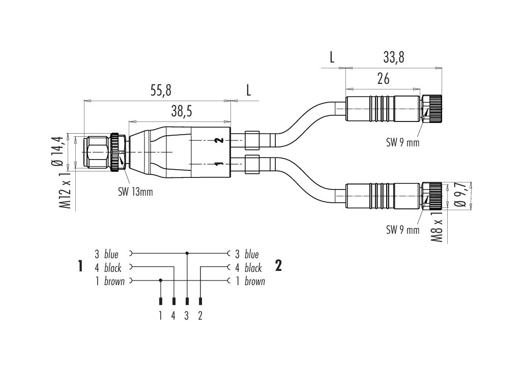 M12/M8 Male cable splitter - 2 female cable connectors, Contacts: 4/3, unshielded, moulded on the cable, IP67, UL 2238, PUR, black, 3 x 0.34 mm², 2 m