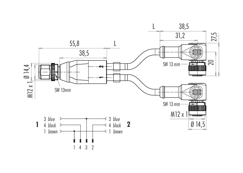 | Connector design | Male cable splitter - 2 female angled connector |