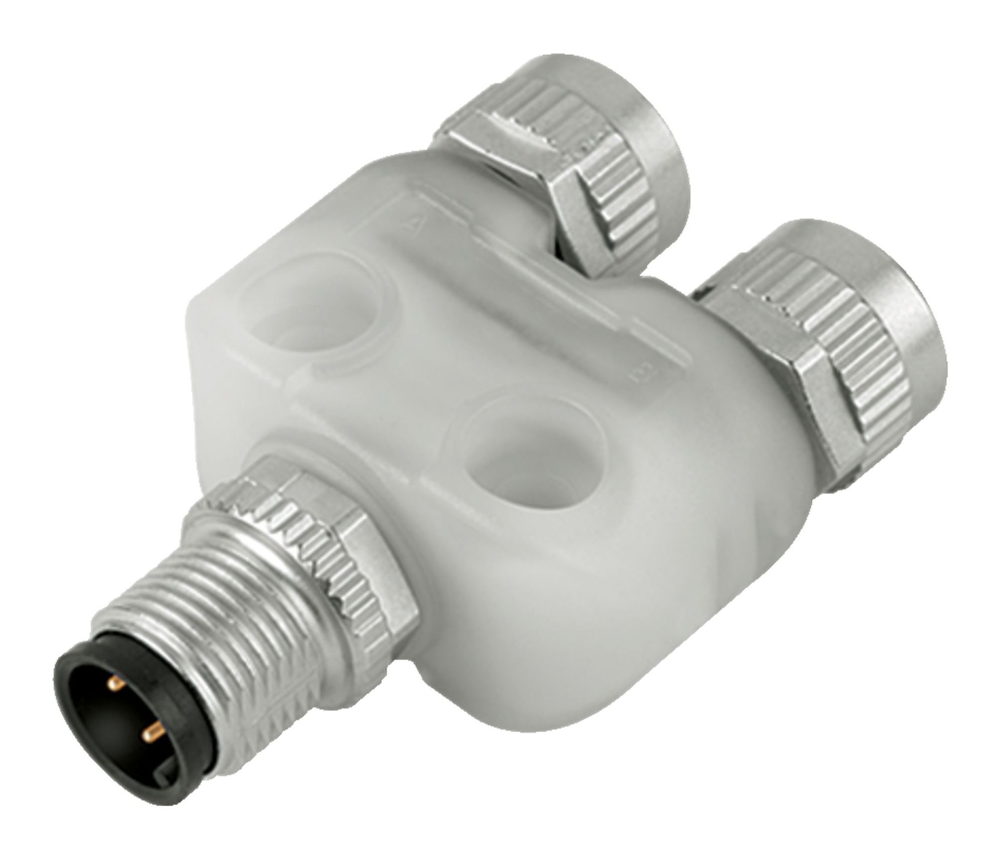 M12 Twin distributors Y-distributor, male connector - 2 female connector, Contacts: 4/3, unshielded, pluggable, IP68, UL 2238, with LED PNP closer