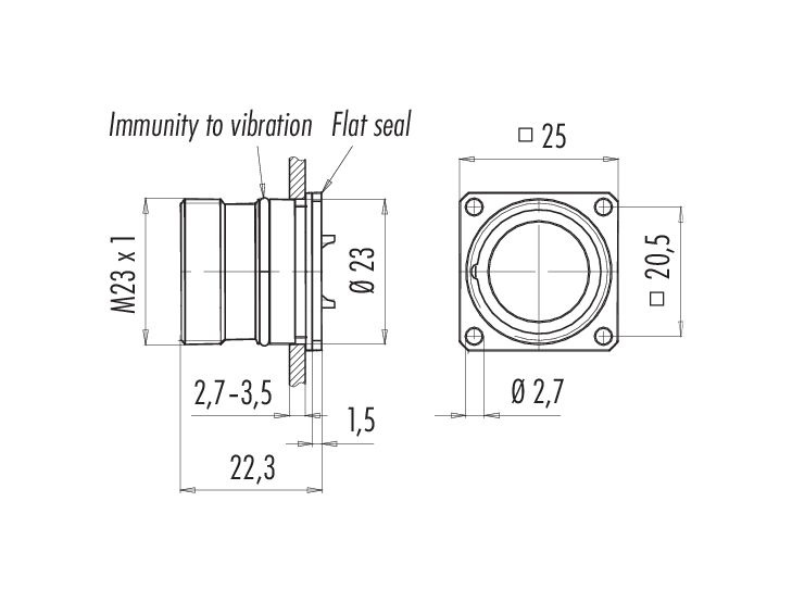 M23 Square male panel mount connector, Contacts: 12, unshielded, solder, IP67, M2 (4x), Rear mounting