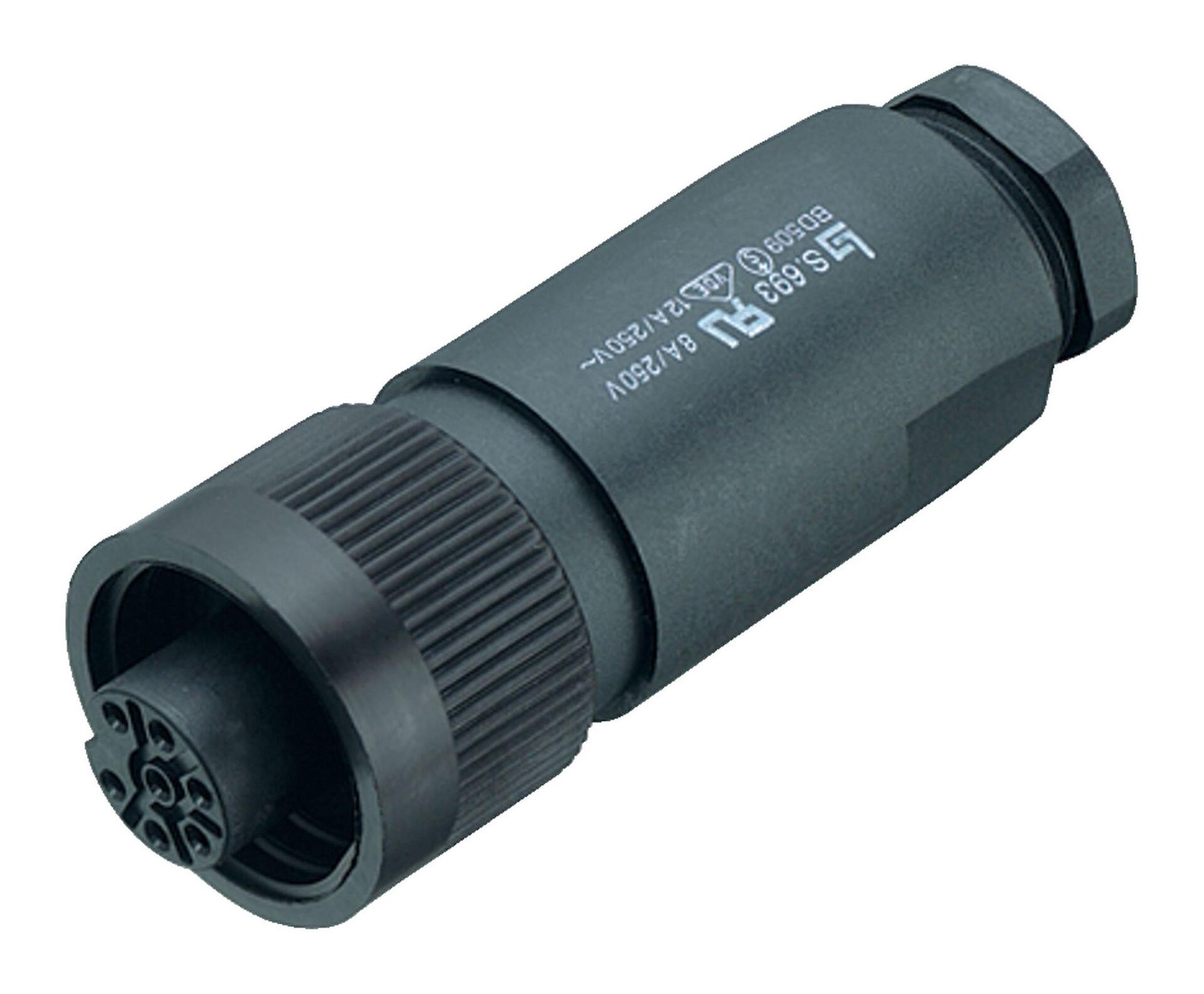This female cable connector with screw locking and a pin count of 6+PE is according to its protection class IP67 Dust-tight and has complete protection against contact and protection against temporary immersion. It can be used in areas with a pollution degree of 3. In places where contamination can occur that is conductive or can become conductive through condensation. With temperatures ranges of -40 °C/100 °C is this unshielded RD24 female cable connector designed for both severe cold and severe heat and has UL, ESTI+, VDE approval. Due to the qualified rated voltage of 250 V and the rated current of 10 A (8 A UL) it is perfectly tuned for its field of application.