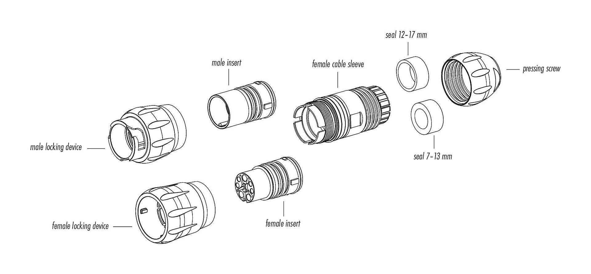 Bayoneta Conector de cable hembra, Número de contactos: 4+3+PE, 7,0-17,0 mm, sin blindaje, crimpado (los contactos de crimpado deben pedirse por separado), IP68/IP69K, UL 2238, VDE, UV-Beständig, racor para manguera protectora