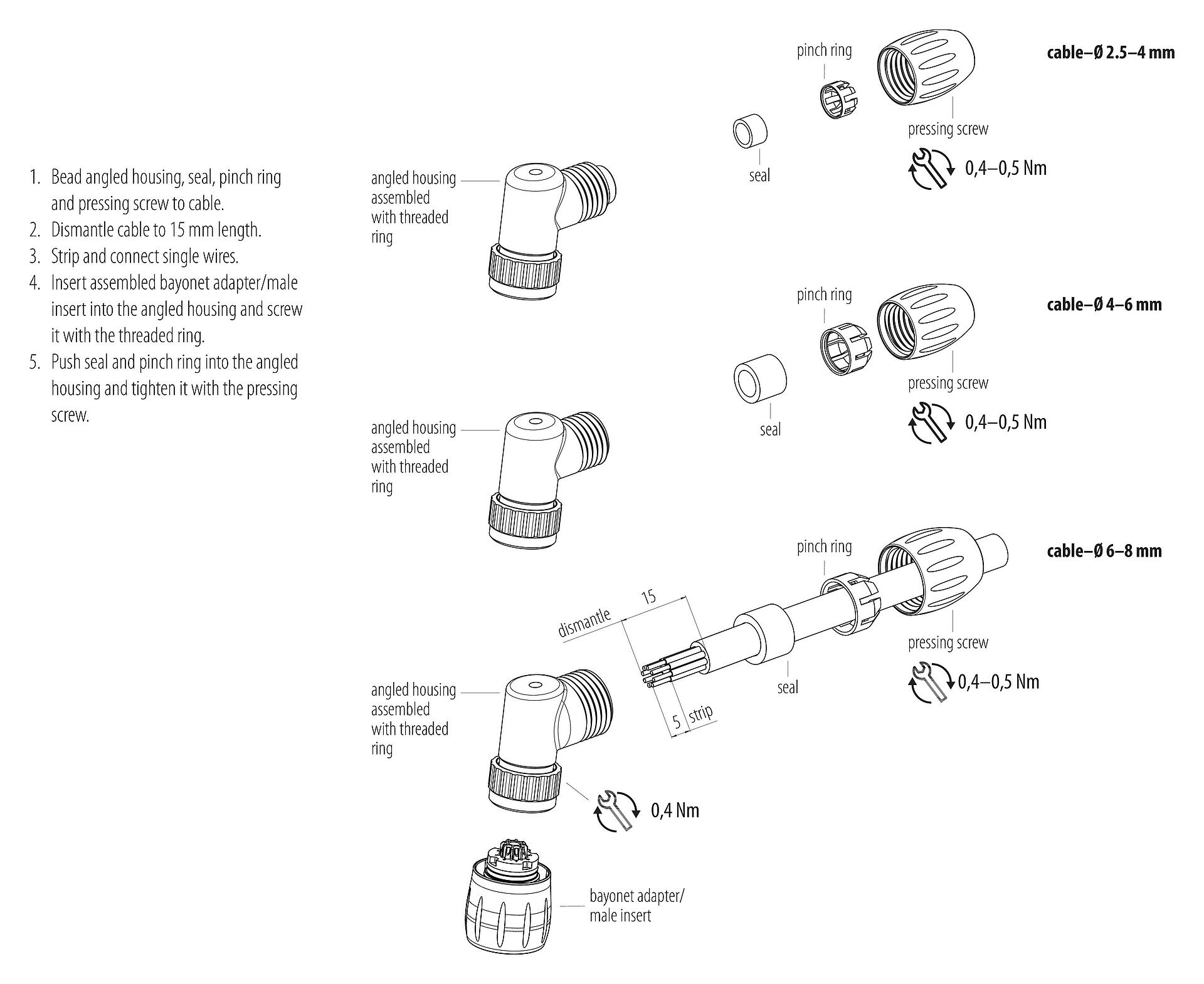 - Para proteger contra la apertura involuntaria del conector, la rosca entre la carcasa y la cabeza del conector debe asegurarse con un adhesivo de cianoacrilato adecuado cuando se use en circuitos con voltajes peligrosos al tacto. Esto no se aplica a los conectores utilizados en circuitos SELV y PELV según IEC 61140 (EN 61140, VDE 0140-1).