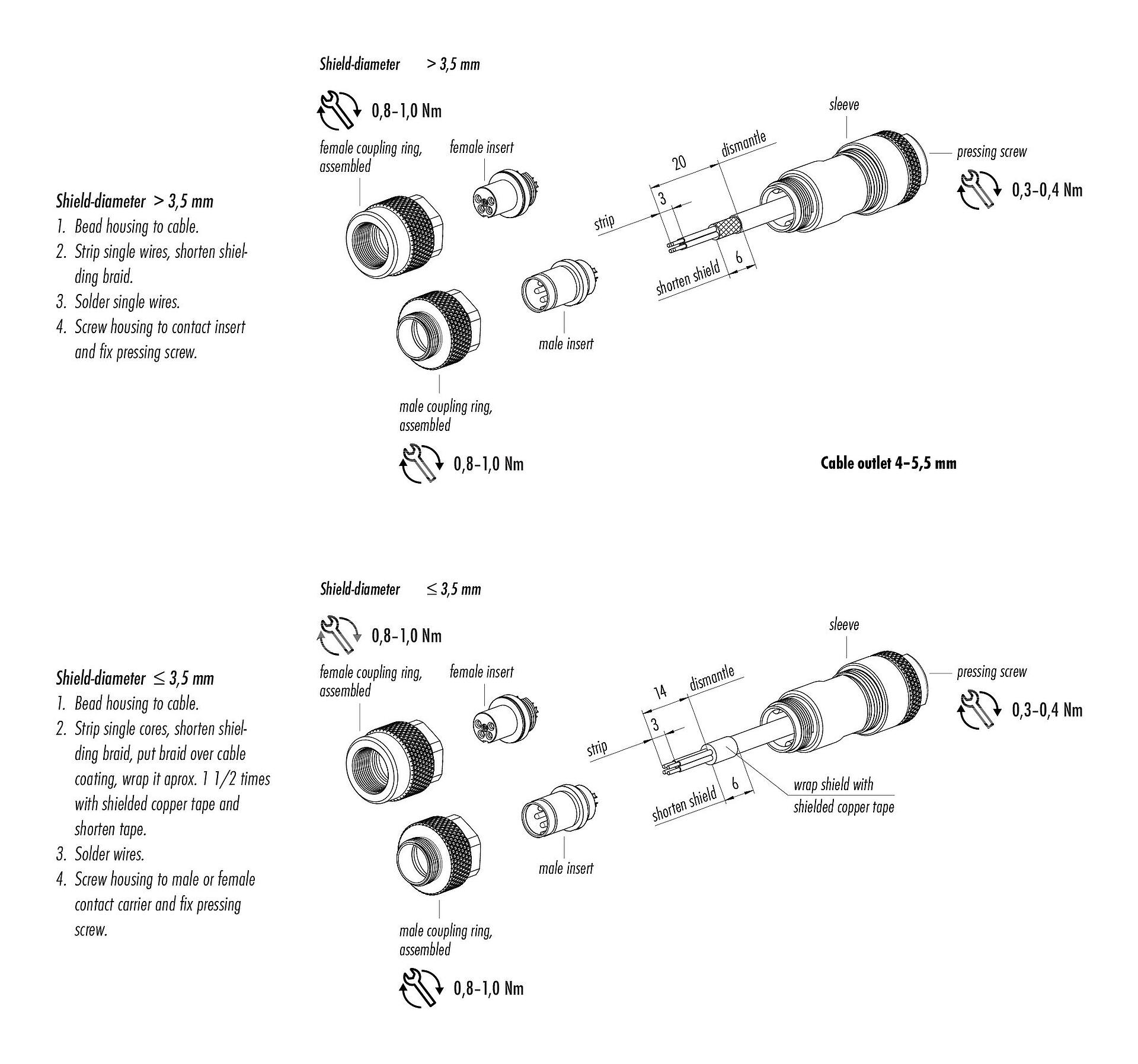 - Para proteger contra la apertura involuntaria del conector, la rosca entre la carcasa y la cabeza del conector debe asegurarse con un adhesivo de cianoacrilato adecuado cuando se use en circuitos con voltajes peligrosos al tacto. Esto no se aplica a los conectores utilizados en circuitos SELV y PELV según IEC 61140 (EN 61140, VDE 0140-1).