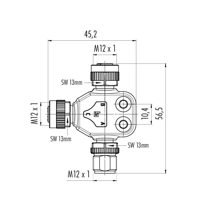 M12 Distribuidor doble, distribuidor de T, macho - 2 tomas, Número de contactos: 4, sin blindaje, enchufable, IP68, UL 2238