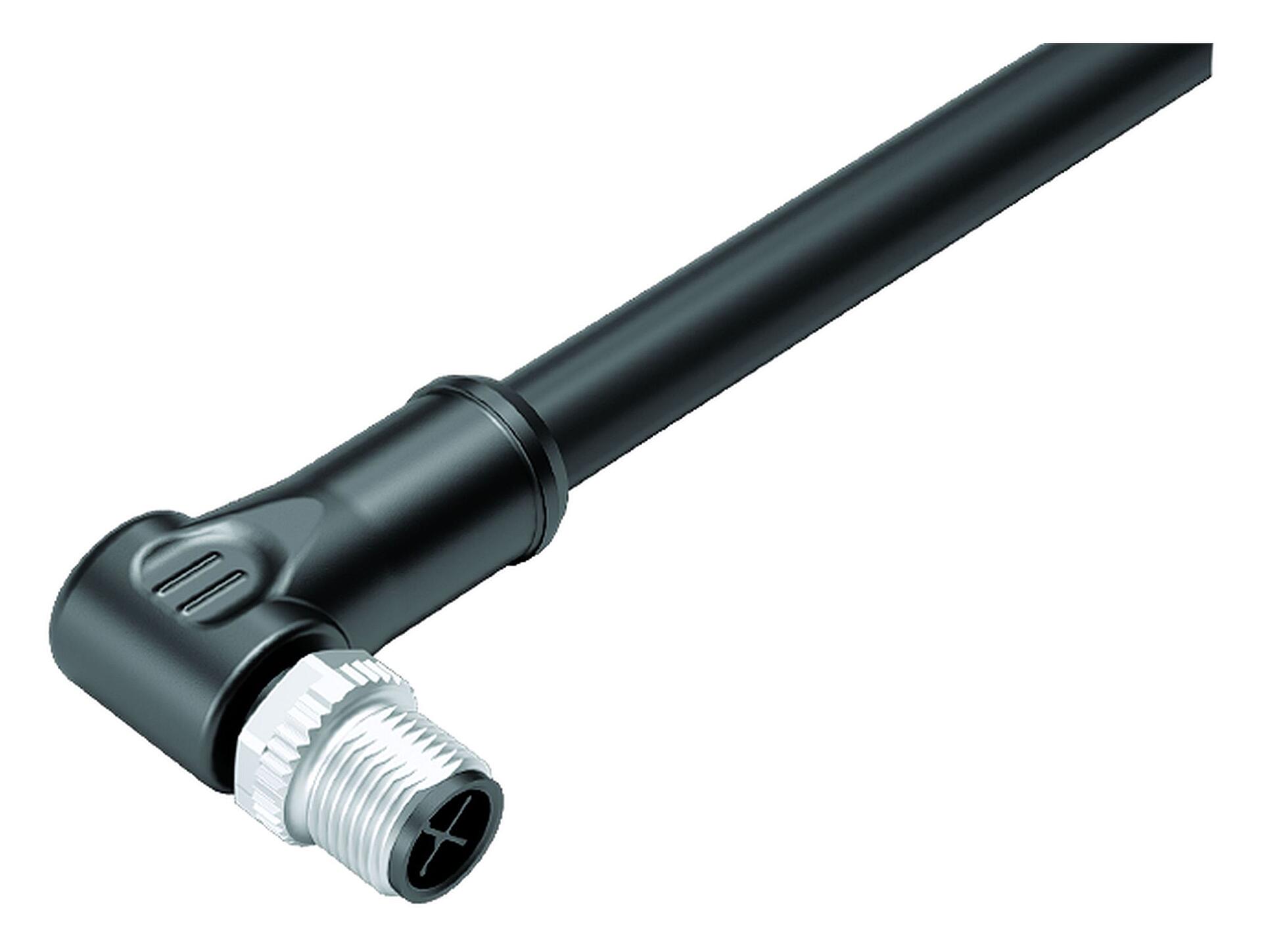 M12 Conector macho en ángulo, Número de contactos: 3+PE, sin blindaje, moldeado en el cable, IP68, UL, PUR, negro, 4 x 1,50 mm², 5 m