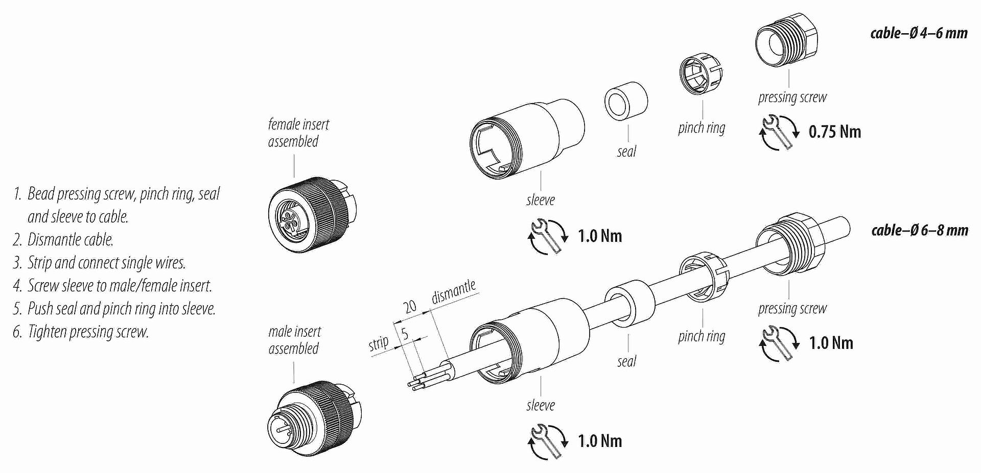 - Para proteger contra la apertura involuntaria del conector, la rosca entre la carcasa y la cabeza del conector debe asegurarse con un adhesivo de cianoacrilato adecuado cuando se use en circuitos con voltajes peligrosos al tacto. Esto no se aplica a los conectores utilizados en circuitos SELV y PELV según IEC 61140 (EN 61140, VDE 0140-1).
