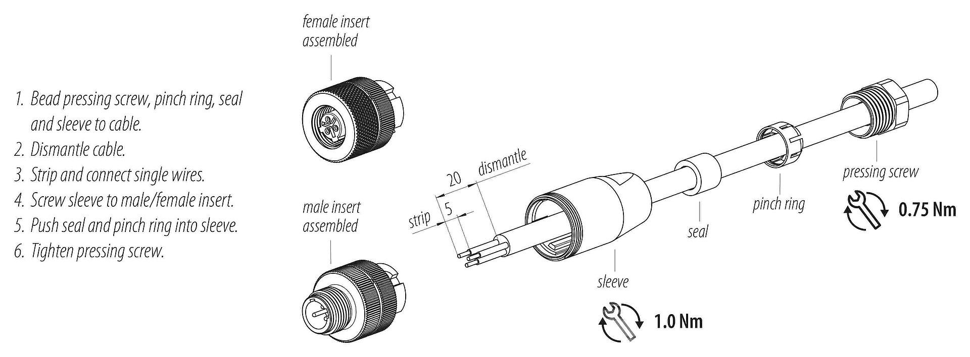 - Para bloquear el conector del cable con el conector del dispositivo, el anillo roscado se aprieta "apretado con la mano"(aprox. 60 cNm).