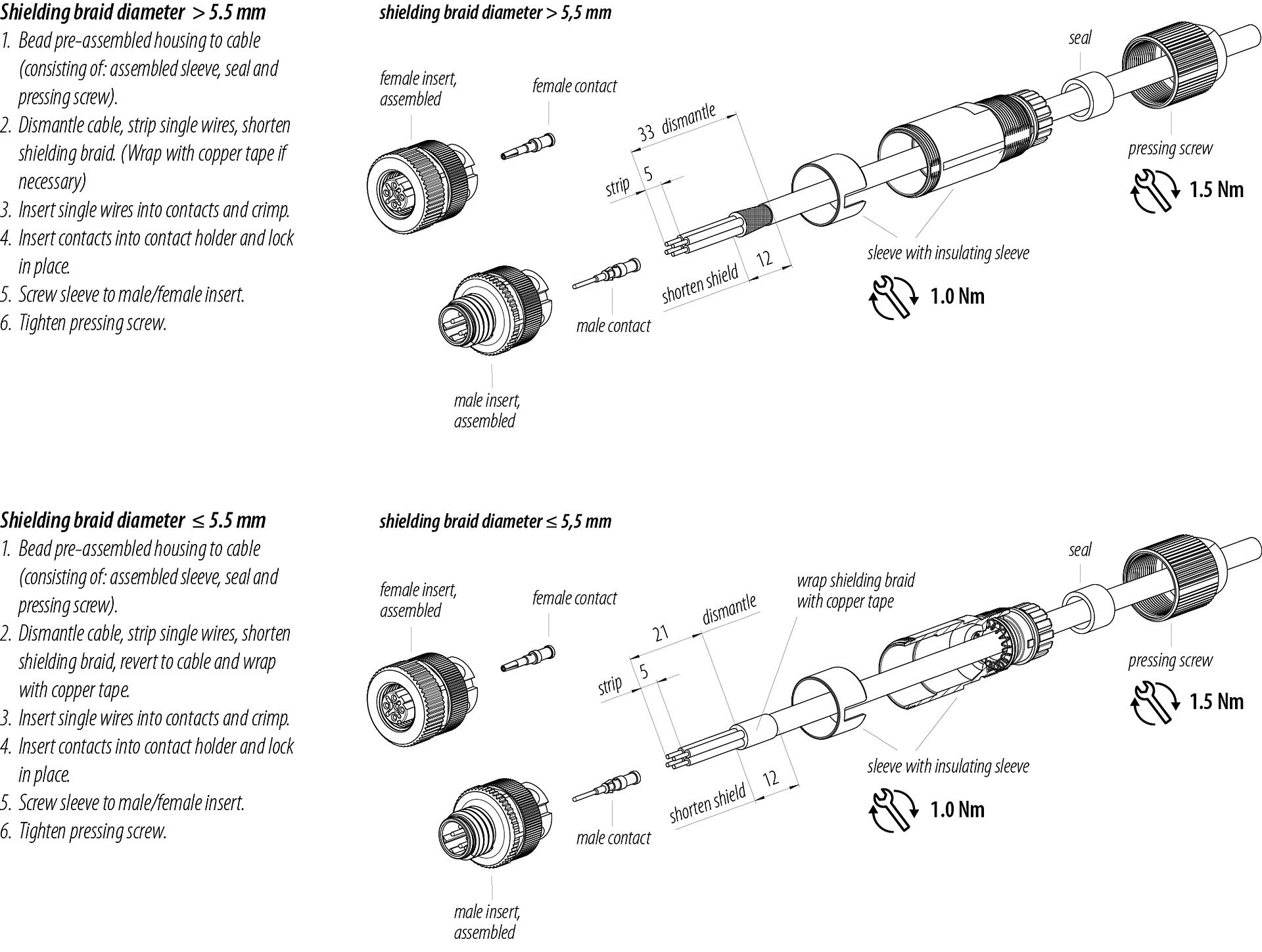 - Para proteger contra la apertura involuntaria del conector, la rosca entre la carcasa y la cabeza del conector debe asegurarse con un adhesivo de cianoacrilato adecuado cuando se use en circuitos con voltajes peligrosos al tacto. Esto no se aplica a los conectores utilizados en circuitos SELV y PELV según IEC 61140 (EN 61140, VDE 0140-1).