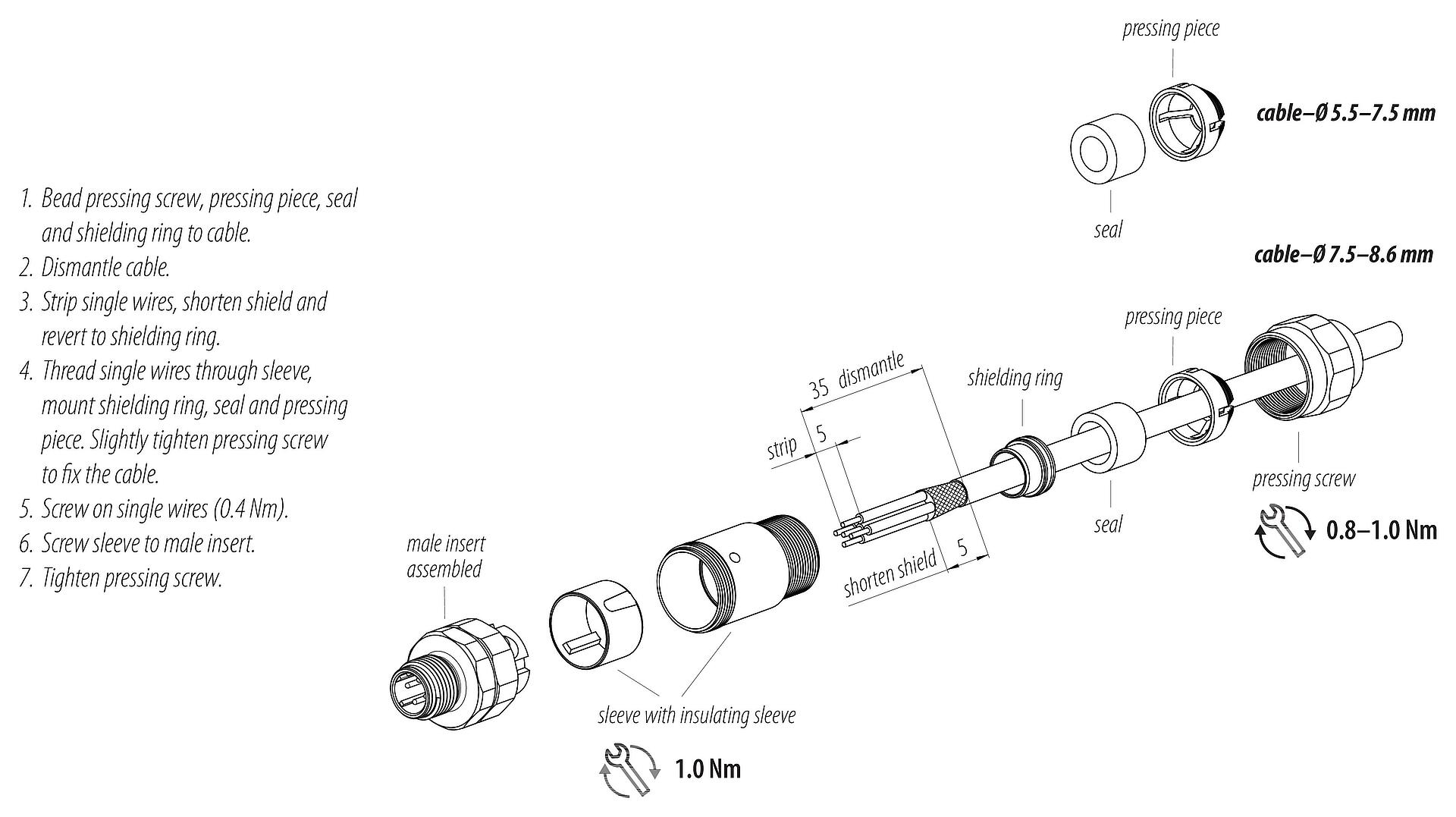 - Para bloquear el conector del cable con el conector del dispositivo, el anillo roscado se aprieta "apretado con la mano"(aprox. 60 cNm).