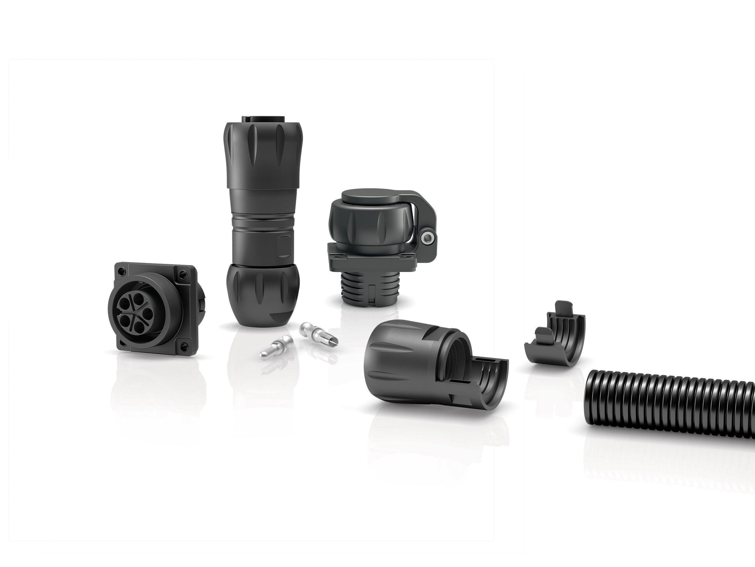 Les connecteurs HEC de 5 à 12 broches sont conçus pour des tensions nominales de 60 à 600 V et des courants de 3 à 32 A. Ils fonctionnent de manière fiable à des températures de fonctionnement comprises entre -40 et +100 °C, résistent aux UV, à l’huile et au carburant ainsi qu’aux vibrations grâce à la connexion à sertir. Cette technologie de connexion mécanique non détachable et sans soudure assure un ajustement particulièrement resserré du fil à la partie terminale du contact.