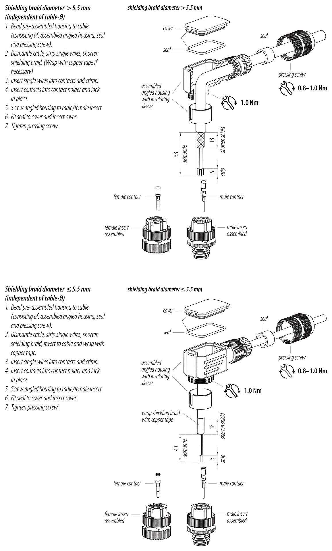 - Pour éviter l'ouverture involontaire du connecteur, lorsqu'il est utilisé dans des circuits dont la tension est dangereuse au toucher, le fil entre le boîtier et la tête du connecteur doit être fixé avec un adhésif cyanoacrylate approprié. Ceci ne s'applique pas aux connecteurs utilisés dans les circuits SELV et PELV selon la norme IEC 61140 (EN 61140, VDE 0140-1).